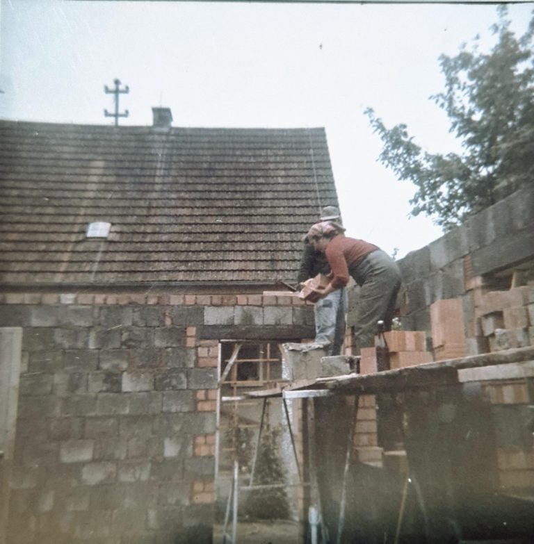 Nach kurzer Zeit wurde die Werkstatt zu klein und es wurde angebaut. Alle halfen zusammen. Sogar meine Oma mauerte mit.…