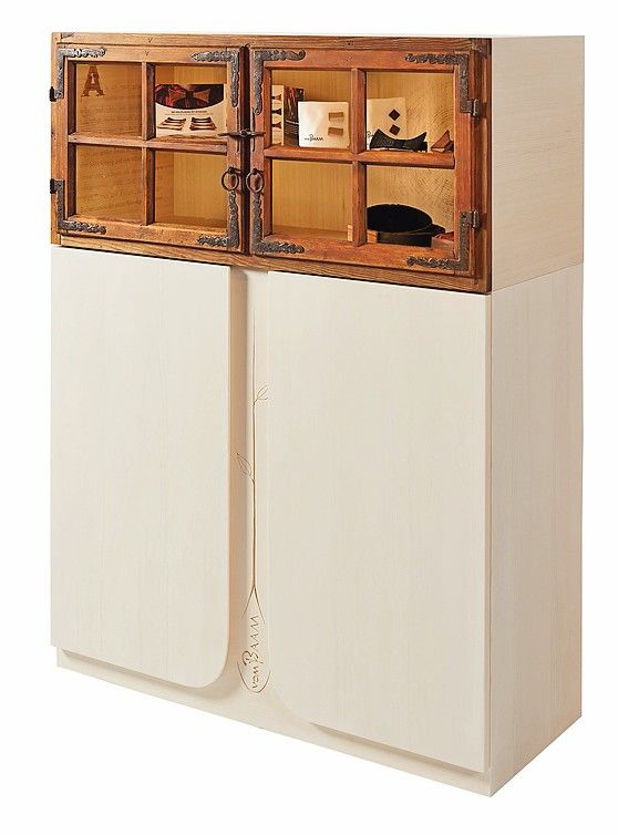 Hinter jeder Schreinerarbeit steht die Geschichte ihres Holzes. Hier ist sie inwendig gelasert und durch die Türen der Vitrine aus einem 200 Jahre alten Holzfenster lesbar. Den schlichten, weiß lasierten Unterkorpus des Möbels aus Tanne schmückt als Schnitzerei zwischen den Türen ein aufsprießender Baum.