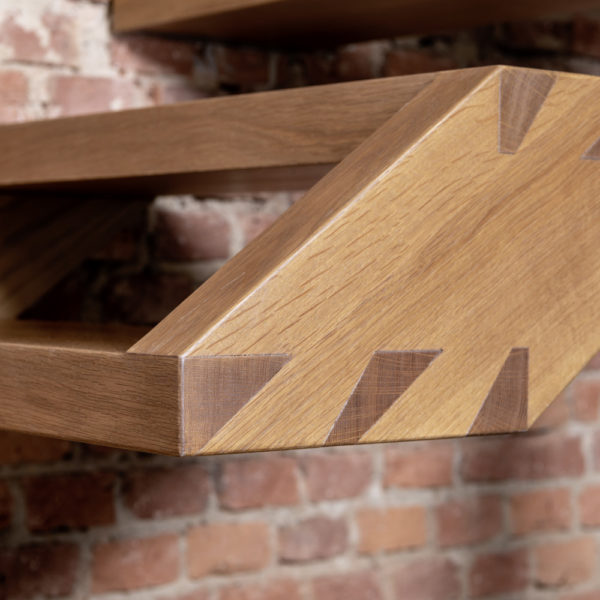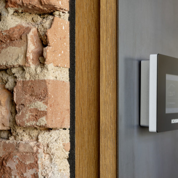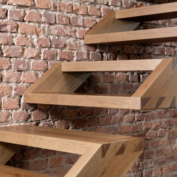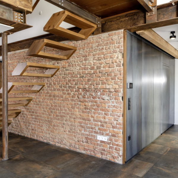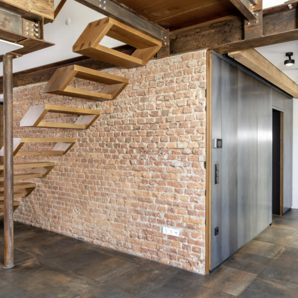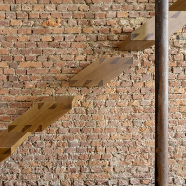Der Innenausbau wurde nach Vorstellung des Bauherrn sehr geradlinig, mit echten Materialien gestaltet. Die Treppe mit den handgemachten Zinkenverbindungen wird durch eine spezielle Unterkonstruktion an der alten Ziegelwand gehalten.