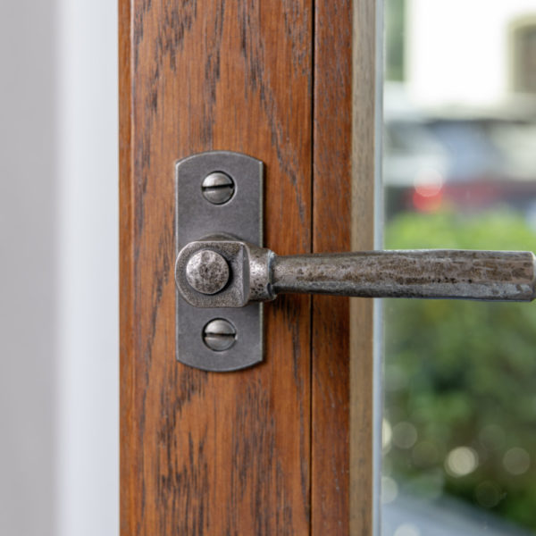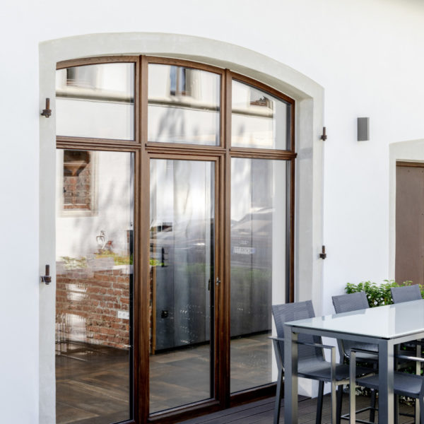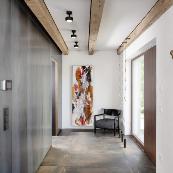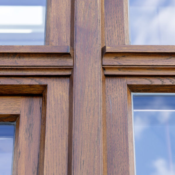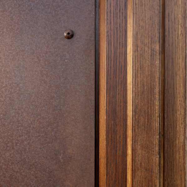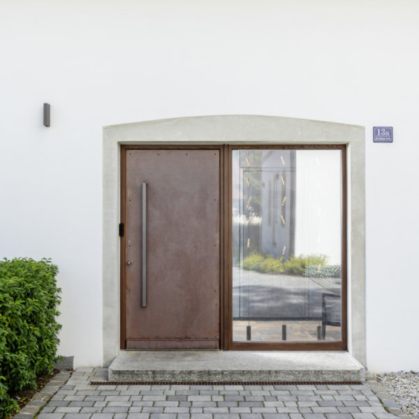 Die Fenster sind aus Eichenholz mit einer Dünnschichtlasur der Firma Adler. Eine gelungene Kombination zum Eichenholz gelang mit der Cortenstahl-Haustür (gerosteter Stahl).