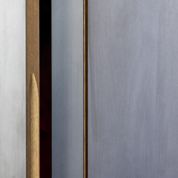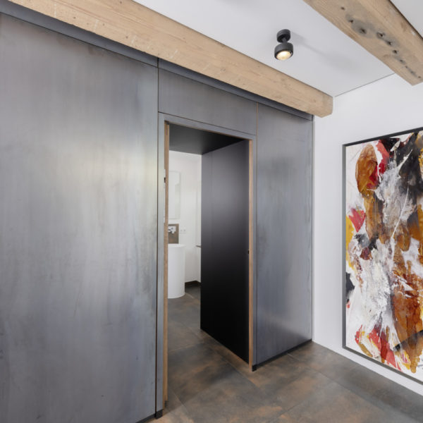 Ein weiteres Highlight ist die mit Stahlblech belegte Schrankwand. Auf einer Eichenrahmenkonstruktion liegt flächenbündig ein Stahlblech. Eine Durchgangstür zum WC wurde grifflos integriert.